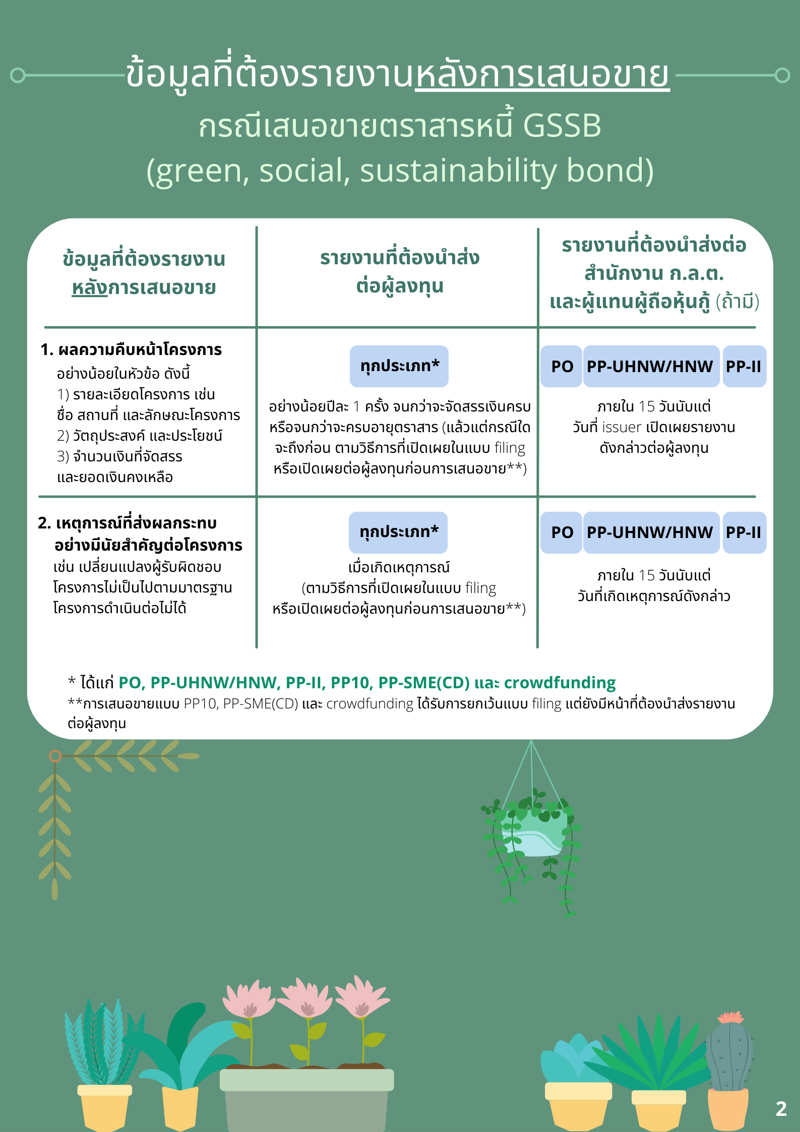 2. การเปิดเผยข้อมูล เพื่อให้ผู้ลงทุนมีข้อมูลที่เพียงพอประกอบการตัดสินใจ issuer จึงต้องเปิดเผยข้อมูลเกี่ยวกับการเสนอขายตราสารหนี้ให้ต้องถูกต้อง ครบถ้วน เพียงพอ และเป็นไปตามมาตรฐานสากล โดยข้อมูลที่ต้องเปิดเผยประกอบด้วย ข้อมูลขั้นต่ำตามมาตรา 69-70 แห่งพระราชบัญญัติหลักทรัพย์และตลาดหลักทรัพย์ พ.ศ. 2535 (พ.ร.บ. หลักทรัพย์ฯ) และข้อมูลเพิ่มเติมอื่น ๆ ที่สำนักงาน ก.ล.ต. กำหนด ได้แก่
